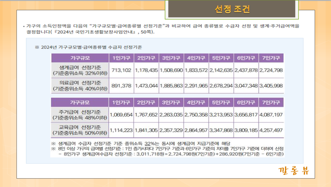 2023년 기준 중위소득을 기준으로, 각 가구원의 소득 기준이 정해집니다. 이에 따라 생계급여는 중위소득의 30%, 의료급여는 40%, 주거급여는 47%, 교육급여는 50% 이하인 경우 수급할 수 있습니다.