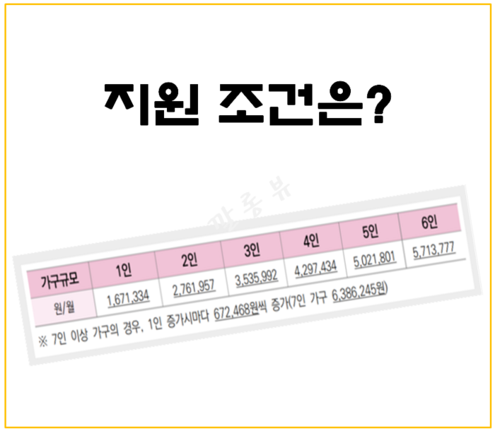 소득 기준이랑 재산 기준을 만족해야 해요. 소득 기준은 중위소득 75% 이하인데, 이건 가구원 수에 따라 금액이 달라요: