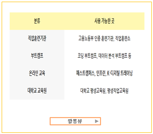 내일배움카드는 정말 다양한 곳에서 사용할 수 있어요. 그리고 고용노동부가 인증한 곳이라 믿고 사용할 수 있답니다.