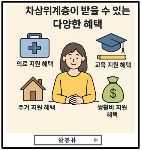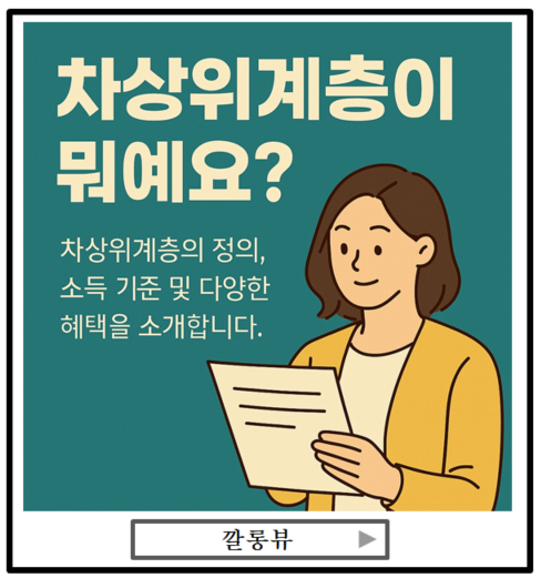 정리하면, 차상위계층이란 경제적으로 어려운 저소득층에게 현금 대신 의료, 교육, 주거, 생활비 등 다양한 복지 혜택을 제공하는 제도입니다. 특히 2025년부터 소득 기준이 상향 조정되어 더 많은 사람들이 혜택을 받을 수 있게 되었으니, 지금 본인의 상황을 정확히 점검하고 혜택을 놓치지 말고 꼭 신청해 생활에 실질적인 도움을 받으시길 바랍니다!