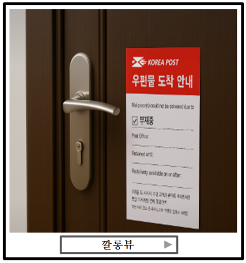 부재중일 때 등기우편을 받지 못하셨다면, 집 앞에 붙어 있는 '우편물 도착 안내문'을 꼭 확인해보세요. 요즘은 문자나 카카오톡 알림톡으로도 도착 안내를 해주는 경우가 많습니다.