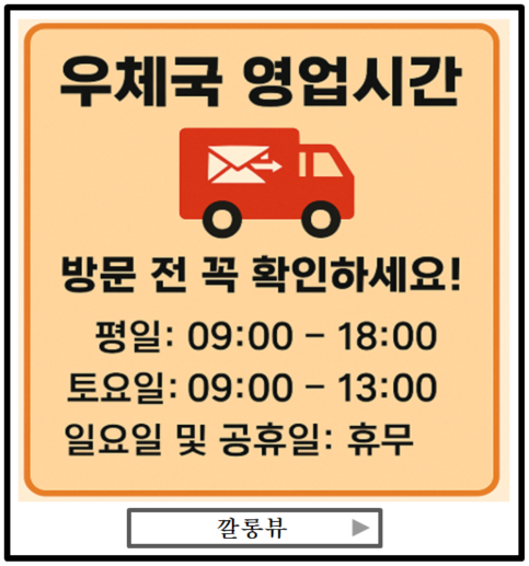 📱 ‘우체국 앱’이나 포털 사이트에서 ‘내 주변 우체국’을 검색하시면 위치와 운영시간을 쉽게 확인하실 수 있습니다.