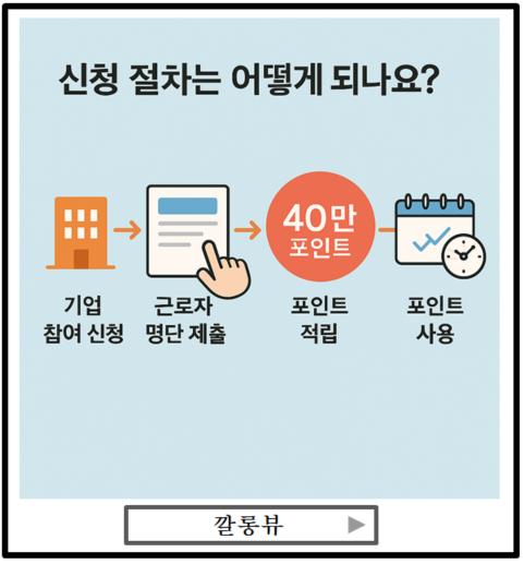 5. 정부가 지원금을 추가해서 총 40만 원 포인트가 적립됨 여기서 기억해야 할 건, 분담금까지 입금이 완료돼야 포인트가 들어온다는 거예요. 절차만 보면 복잡해 보여도 실제로는 회사가 대부분 진행하고, 직원은 안내만 잘 받으면 끝이에요.