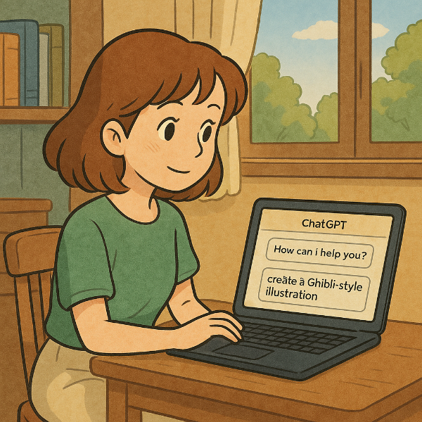 챗GPT를 열면 처음에 뭘 도와줄까요? 라는 메시지가 뜨는데, 거기에 그냥 원하는 이미지를 말하면 돼요. 예를 들어, “지브리 스타일로 노트북 앞에 앉은 여성을 그려줘”라고 적으면, 잠시 뒤에 감성 폭발하는 그림이 짠! 하고 나옵니다.