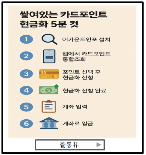 카드포인트 현금화, 어카운트인포, 통합조회. 이 세 가지만 기억하시면 누구나 바로 시작하실 수 있습니다. 저처럼 몰랐던 숨은 돈 찾고 기분 좋아지시길 바랄게요. 오늘 커피 한 잔, 이 포인트로 사보시는 건 어떨까요?