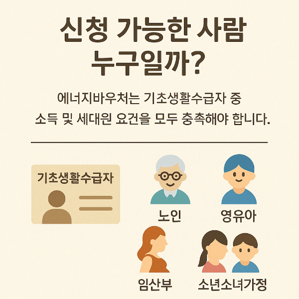 모두가 받을 수 있는 건 아니고요, 먼저 기초생활수급자여야 해요. 생계급여, 의료급여, 주거급여, 교육급여 중 하나라도 해당되셔야 하고요. 그리고 세대원 중에 노인, 영유아, 장애인, 임산부, 중증·희귀질환자, 한부모가정, 소년소녀가정이 있다면 신청 자격이 됩니다. 조건이 그렇게 복잡하진 않지만, 정확히 확인하는 게 중요해요.