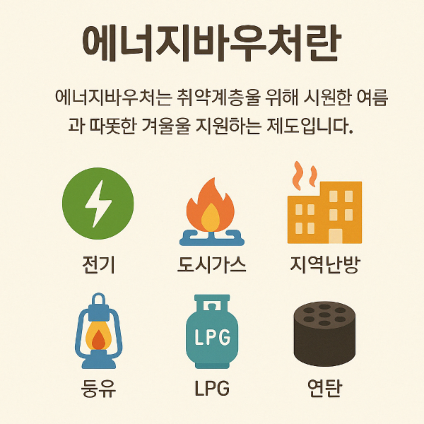 간단하게 말씀드리면 전기, 도시가스, 지역난방, LPG, 연탄, 등유 등에 사용할 수 있는 ‘에너지 이용권’을 정부가 지급하는 제도예요. 기초생활수급자 중 특정 조건을 충족하는 분들에게 여름엔 시원하게, 겨울엔 따뜻하게 보낼 수 있도록 도와주는 정책입니다.