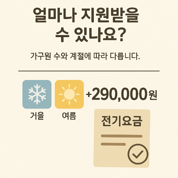 지원 금액은 계절과 가구원 수에 따라 달라요. 여름과 겨울 각각 바우처가 따로 나뉘어 있고, 보통 연 29만 원 이상 지원된다고 보시면 돼요. 요금이 차감되는 방식이라, 실제로 고지서에서 금액이 줄어든 걸로 확인하실 수 있어요.