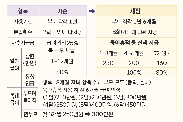 - 육아휴직 기간이 기존 1년에서 1년 6개월로 확대