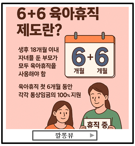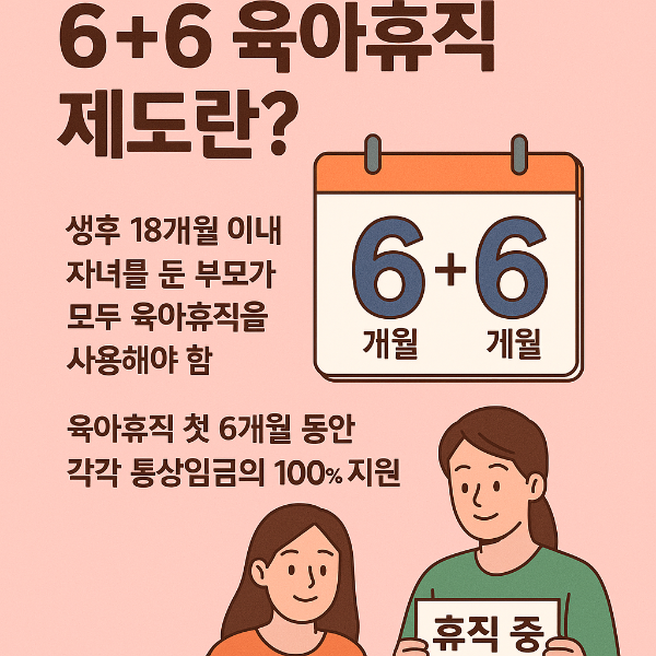 6+6 육아휴직 제도는 자녀가 생후 18개월이 되기 전까지 맞벌이 부모가 모두 육아휴직을 사용할 경우, 각자 처음 6개월 동안 육아휴직 급여를 기존보다 더 인상된 금액으로 받을 수 있도록 설계된 정책입니다. 각 부모에게 최대 6개월간 통상임금의 100%를 지급하며, 월 최대 250만 원까지 수령이 가능합니다. 이처럼 육아휴직 제도는 단순한 복지가 아닌, 가족의 삶의 질을 높이는 중요한 정책입니다.