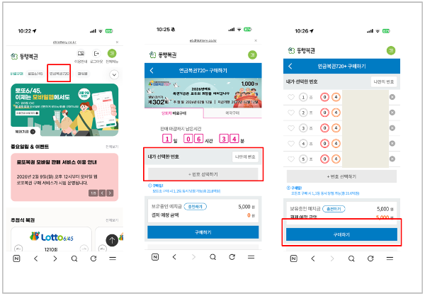 연금복권720 클릭 -> 번호선택 -> 구매하기 버튼으로 구매 완료하기!