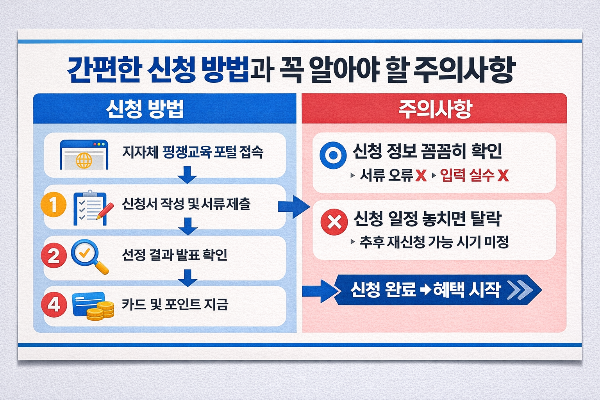 즉, 2026 평생교육이용권 신청은 ‘내가 사는 지역 공고 확인’이 핵심입니다.
