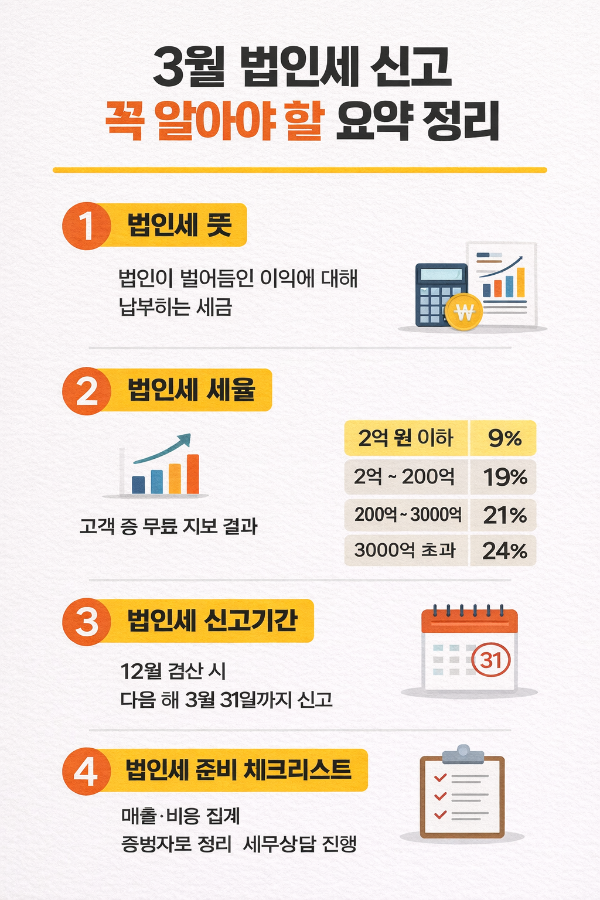 특히 3월 법인세 신고 시즌이 되기 전에 매출·비용 정리와 증빙 관리를 미리 준비하는 것이 중요합니다.