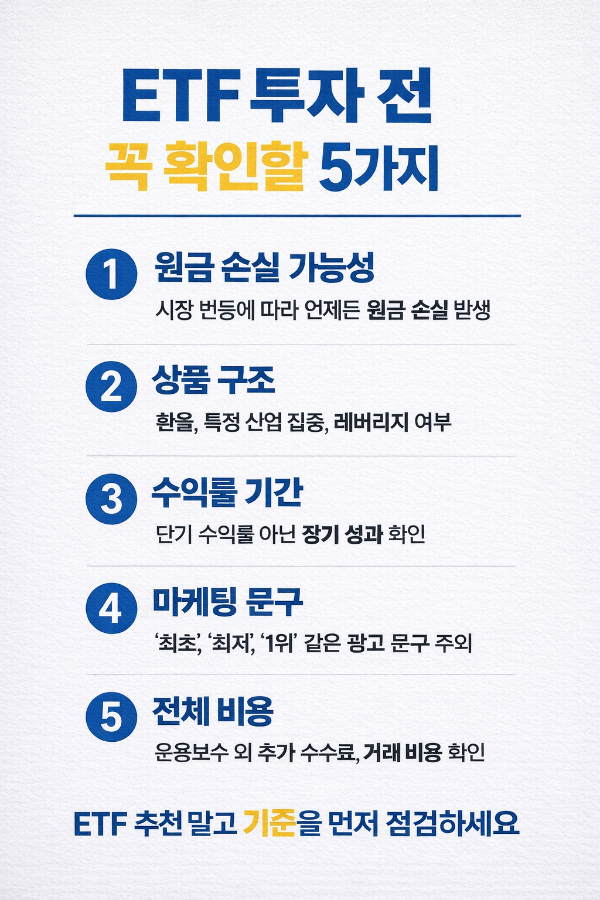 이 기준만 지켜도 ETF 투자에서 불필요한 실수를 크게 줄일 수 있습니다.