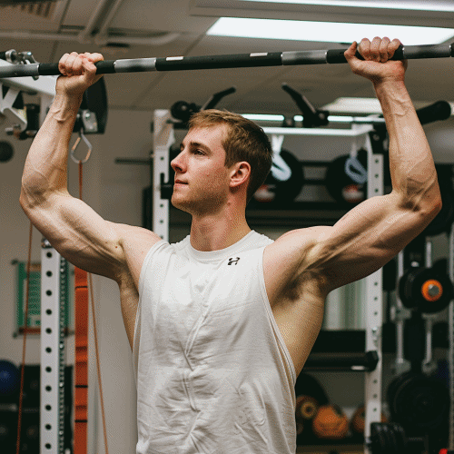 운동 방법: 바벨을 어깨 높이로 들어올리고, 손을 펴 양쪽으로 밀어 올립니다. 그리고 천천히 내려놓습니다.